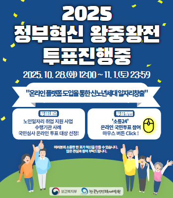 ※ 노인일자리사업 및 한국노인인력개발원의 주요 공지사항을(를) 게시하는 페이지입니다.| 2025 정부혁신 왕중왕전 온라인 국민심사(투표 바로가기) | |||