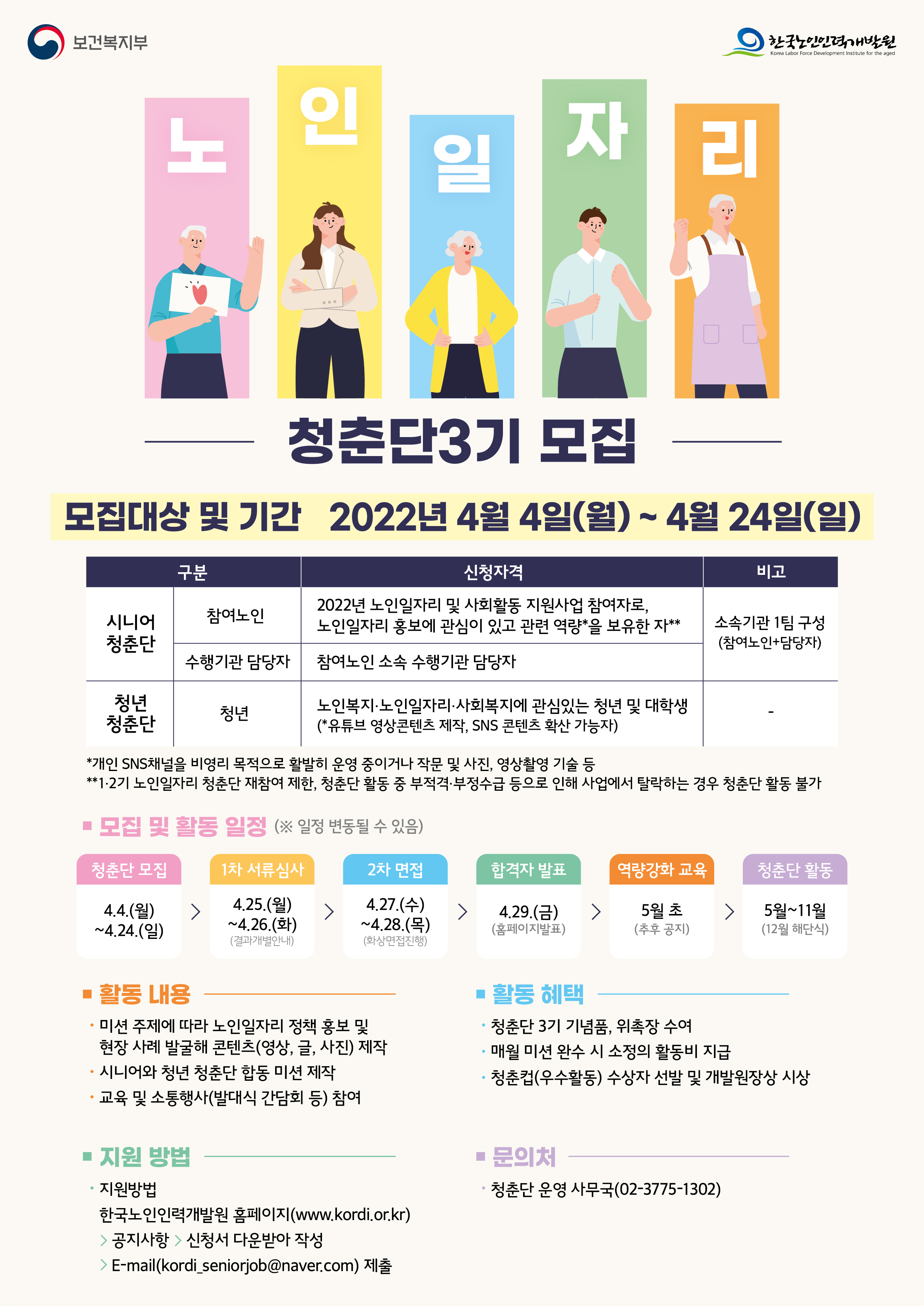 한국노인인력개발원에서 "노인일자리 청춘단 3기"를 모집합니다. 노인일자리에 관심있는 많은 분들의 참여 바랍니다. ![]() ![]() [모집대상] - 시니어청춘단(참여노인) : 2022년 노인일자리 및 사회활동지원사업 참여자로, 노인일자리 정책 및 홍보에 관심이 있고 관련 역량을 보유한 자 - 시니어청춘단(수행기관 담당자) : 참여노인 소속 수행기관 담당자 - 청년 : 노인복지, 노인일자리, 사회복지에 관심있고 개인 SNS를 운영하고 있는 대학생 등(별도 제한없음) ※ 단, 다양한 현장 콘텐츠 발굴을 위해 '노인일자리 청춘단 1,2기' 재참여 제한 [모집일정] - 모집기간: 2022.4.4.~4.24. - 최종발표: 2022.4.29. ※ 개발원 홈페이지 공지 및 개별통보 [활동기간] - 2022.5.1.~11.30. (7개월) [활동내용] - 월별 청춘단 수행 미션을 통해 노인일자리 홍보 - 노인일자리 사업 현장 사례 발굴(우수, 미담 사례 등) - 교육 및 소통행사(간담회 등) 참여 등 [활동혜택] - 청춘단 기념품, 위촉장 수여 - 매월 미션 완수 시 소정의 활동비(월 10만원) 지급 - 청춘컵(우수청춘단 등) 선발 및 개발원장상 시상 [지원방법] - 한국노인인력개발원 홈페이지 공지사항 → 지원서 다운받아 작성 후 이메일 제출 - 제출처: 청춘단 운영 사무국 - E-mail: kordi_seniorjob@naver.com [문의처] - 청춘단 운영 사무국 - 전화: 02-3775-1302 [유의사항] - 노인일자리 현장 사례 등 홍보 콘텐츠 발굴을 위한 적합자 선발을 우선하며, 모집인원 규모는 조정될 수 있음 - 접수된 서류 및 포트폴리오는 반환되지 않음 - 포트폴리오 제출 시, 반드시 본인 출품작이어야 함 - 신청서 등에 허위기재 또는 기재착오 등으로 인한 불이익은 본인의 책임으로 간주 - 모집 및 활동 일정은 주최측의 사정에 의해 변경될 수 있음 |