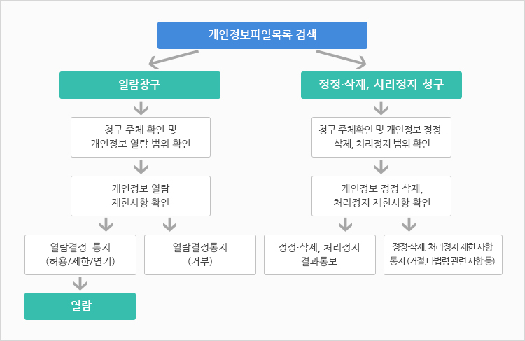가.개 인정보 열람, 정정, 삭제, 처리정지 청구는 아래와 같은 절차로 처리됩니다.